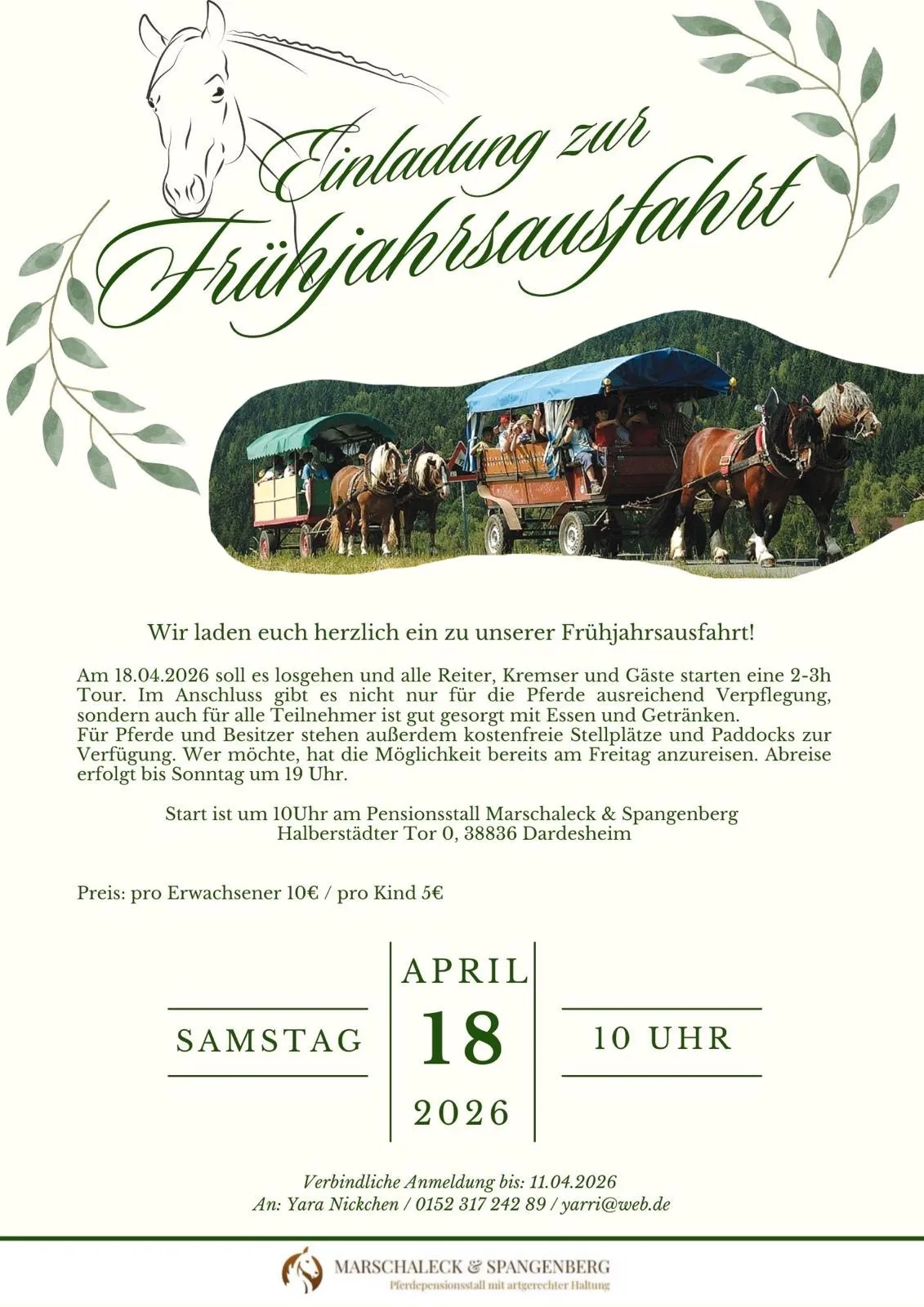 Freut euch auf eine große Ausfahrt durch die Stadt Dardesheim sowie die umliegenden Wiesen und Wege. Sichert euch jetzt verbindlich euren Platz und taucht ein in ein unvergessliches Pferdeerlebnis im Huy-Aue-Fallstein-Kreis.
