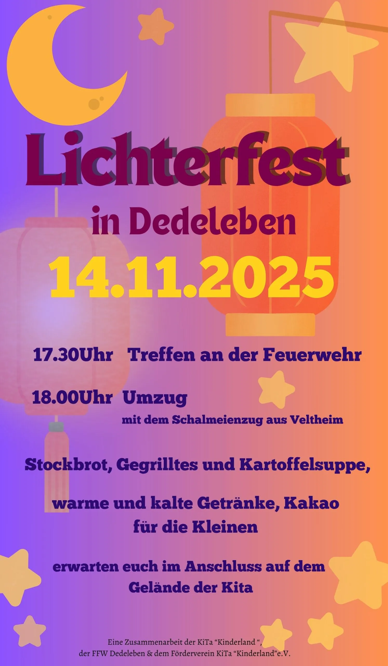 Am Donnerstag, den 14. November 2025, verwandelt sich Dedeleben wieder in ein Meer aus Lichtern! Die Kita „Kinderland“ freut sich darauf, Sie und Ihre Familie zum stimmungsvollen Lichterfest willkommen zu heißen.
